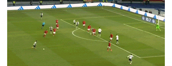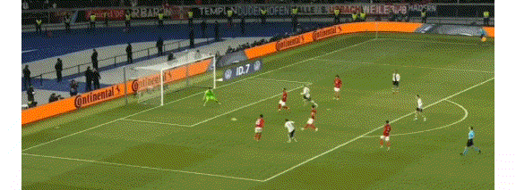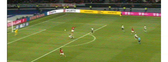 第5分钟,萨内前插倒三角传到小禁区前,哈弗茨右脚轻松推了一个死角!德国1-0!