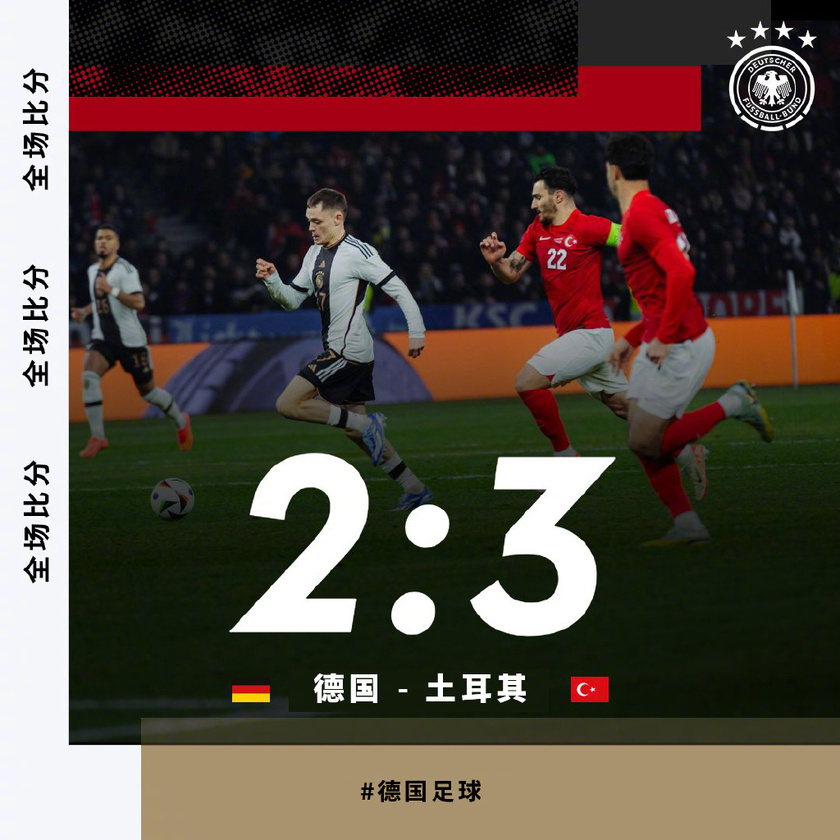 nba直播讯 北京时间3:45,德国与土耳其进行了一场友谊赛。上半场,哈弗茨首开纪录,土耳其连入两球反超;下半场菲尔克鲁格扳平,哈弗茨手球送点。最终德国2-3不敌土耳其,吞下近9场比赛的第5场败仗!