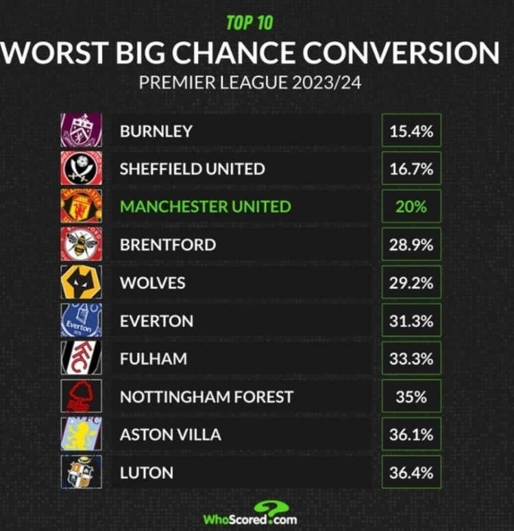 nba直播讯 数据网站Whoscored盘点了本赛季英超重大机会转化率最差球队榜单,其中曼联20%位列第三位,以下为具体榜单: