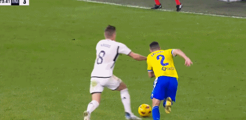 第74分钟,克罗斯断球,随后罗德里戈推进接着分球贝林厄姆,后者小角度打远角得手,皇马3-0加的斯。