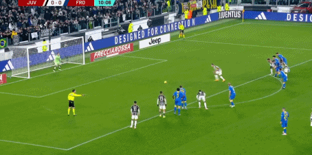 第9分钟,米雷蒂在多人包夹下突入禁区被放倒,主裁判判罚点球。VAR确认后维持点球判罚,米利克主罚点球命中,尤文1-0领先弗洛西诺内