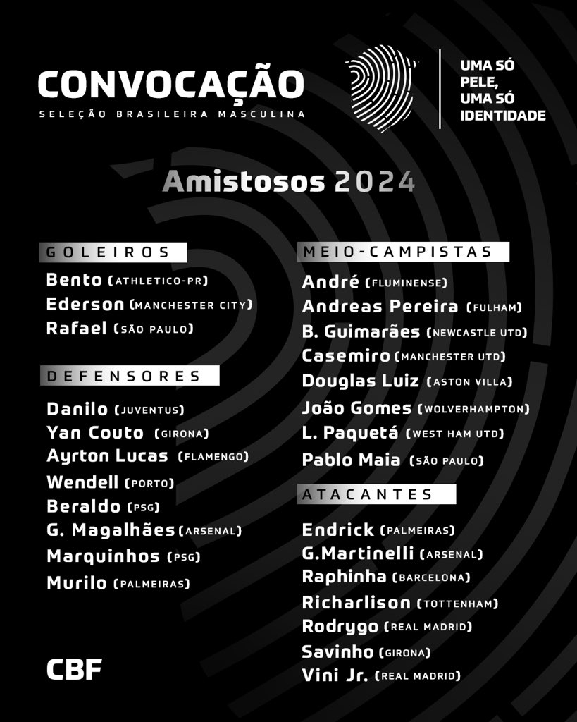 nba直播讯 巴西国家队公布了最新一期的大名单,其中,17岁的恩德里克入选,此外,阿利森、蒂亚戈-席尔瓦、内马尔伤缺,理查利森、卡塞米罗、马丁内利、加布里埃尔、埃德森等人入选。