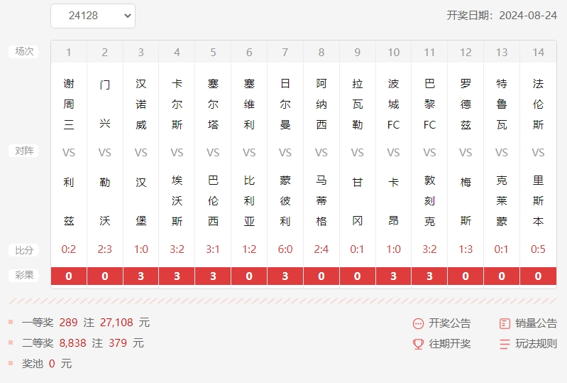 nba直播讯 北京时间8月24日,胜负彩第24128期开奖结果揭晓。本期胜负彩迎来了德甲联赛的回归,至此五大联赛已经集齐,可以召唤神龙许下愿望了!当然第一场的德甲联赛也是让球迷朋友过足戏瘾,门兴2-3勒沃库森,这场比赛同样也是未到最后一刻也无法分出胜负,非常刺激。德乙方面,汉堡0-1汉诺威客场败北,这场比赛预期会有部分朋友没有防一手3。而没有了姆巴佩的巴黎圣日耳曼居然6-0狂扫蒙彼利埃,不得不说大巴黎比上赛季更加狂妄,可以提前宣告大巴黎是法甲冠军的归宿了,其他球队是打不过,真的打不过。大巴黎这赛季的任务就是在欧冠亲手拿下皇马,这样以来那谁会不会显得异常尴尬。