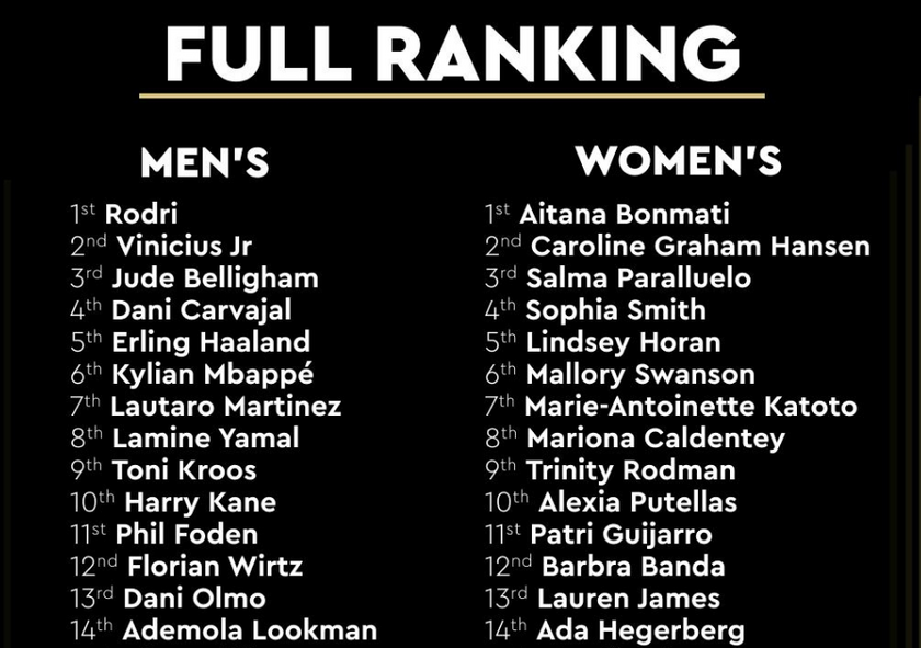 nba直播讯 10月29日 金球奖颁奖礼完成,金球奖官方公布提名球员的排名,罗德里夺得金球奖。