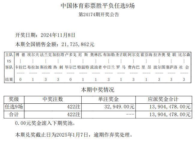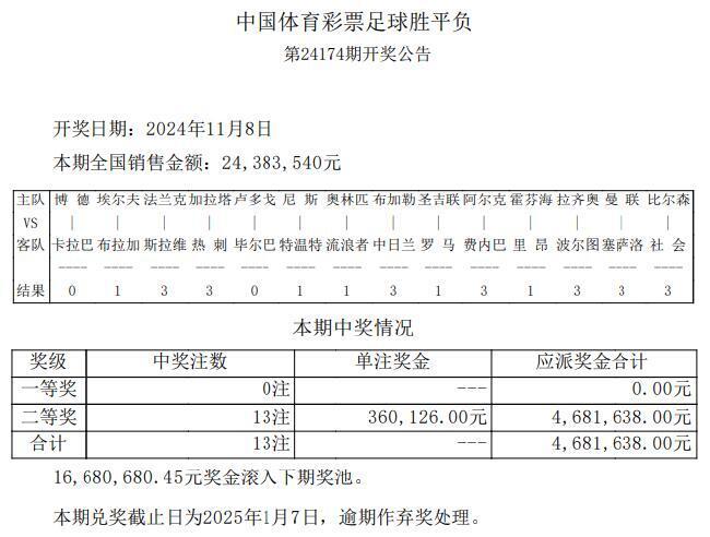 nba直播讯 北京时间11月8日,胜负彩第24174期开奖结果揭晓。本期14场仅打出5场首赔,导致一等奖空开,二等开出13注360,126元,16,680,680.45元奖金滚入下期奖池;任九开出422注32,949元。本期胜负彩销量为24,383,540元,任九投注总额为21,725,862元。