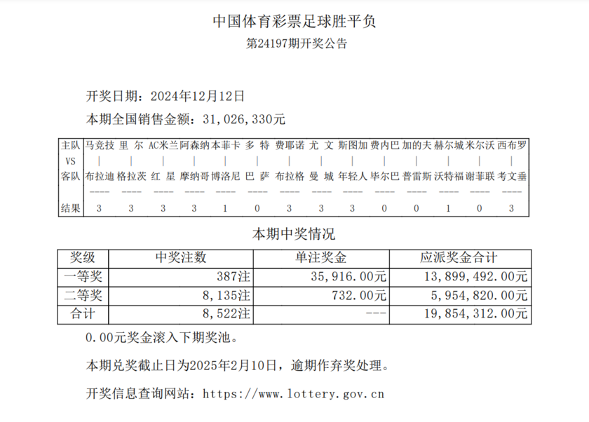 奖金方面,14场一等奖共开出387注,单注奖金35,916元;二等奖开出8,135注,单注奖金732元;任九玩法共开出52,764注,单注奖金252元。本期胜负彩总销量为31,026,330元,任九投注总额为20,816,642元。