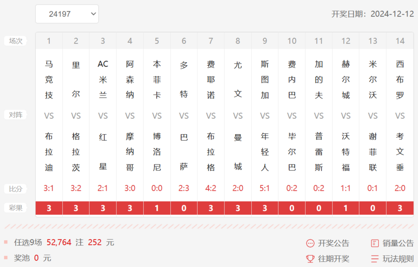 12月12日,胜负彩第24197期开奖结果公布,本期胜负彩冷门场次较少,仅有4场冷门赛事。其中,欧冠赛场上,本菲卡主场0-0闷平博洛尼亚,打出4.7倍冷门;曼城客场0-2不敌尤文,爆出3.9倍冷门。此外,英冠联赛中,赫尔城战平沃特福德、普雷斯顿客场击败卡迪夫城,均打出超过3倍的冷门赛果。其余场次,马竞、里尔、米兰、阿森纳、巴萨、费耶诺德、斯图加特、毕尔巴鄂、谢菲联、西布朗等球队均顺利打出正路赛果。