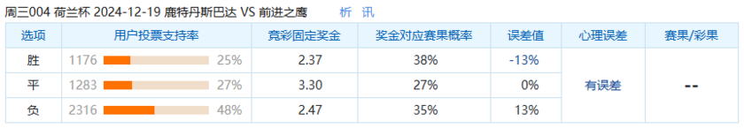 往绩方面,鹿特丹斯巴达在赛季初的联赛中就曾主场1-2输过给对手。本场比赛主队-0的数据支持一般,但是后期却有数据偏向之嫌。前进之鹰近期表现明显优于对手尤其是进攻方面,他们可谓是火力全开,加上本赛季已经击败过对手,此战优势面十足的情况下却未得到数据支持,明显不合理,因此本场比赛看好鹿特丹斯巴达坐和望赢。