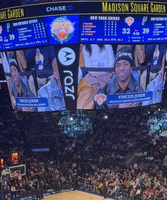nba直播讯 北京时间今天凌晨,NBA圣诞大战,尼克斯坐镇主场迎战马刺。本场比赛尼克斯主场麦迪逊花园球场也是迎来一位重量级嘉宾,不久前刚刚夺得世界足球先生的维尼修斯现身现场,观战尼克斯VS马刺的比赛。