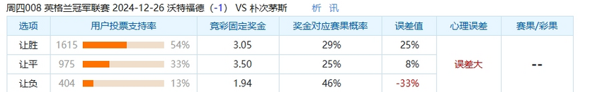 本场比赛中,选择沃特福德让球负的球迷偏少了,只有46%的球迷选择让球负选项,这场比赛中,大家都看好主场的沃特福德会赢得这场比赛,不看好朴茨茅斯能在客场保住分数,但是这也与奖金对应赛果概率的46%相差33%。