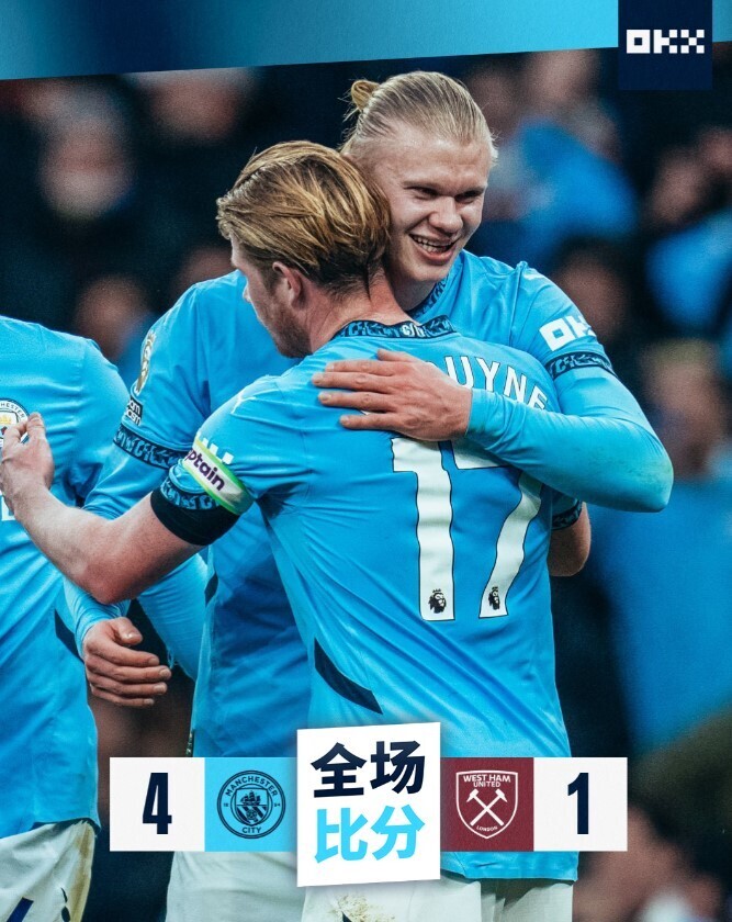 北京时间1月4日23点,英超第20轮,曼城对阵西汉姆联。伊蒂哈德球场进行这场比赛。上半场,萨维尼奥造成曹法尔出现乌龙,后续萨维尼奥助攻哈兰德,顺利扩大领先优势,半场结束,曼城2-0西汉姆联。下半场,萨维尼奥二次助攻,哈兰德获得单刀机会,顺利得分,德布劳内也助攻福登,曼城大幅领先,菲尔克鲁格虽然进球,扳回一城,也无济于事。完场,曼城4-1西汉姆联,曼城拿到34分,排名英超第6,西汉姆联,排名英超第13。