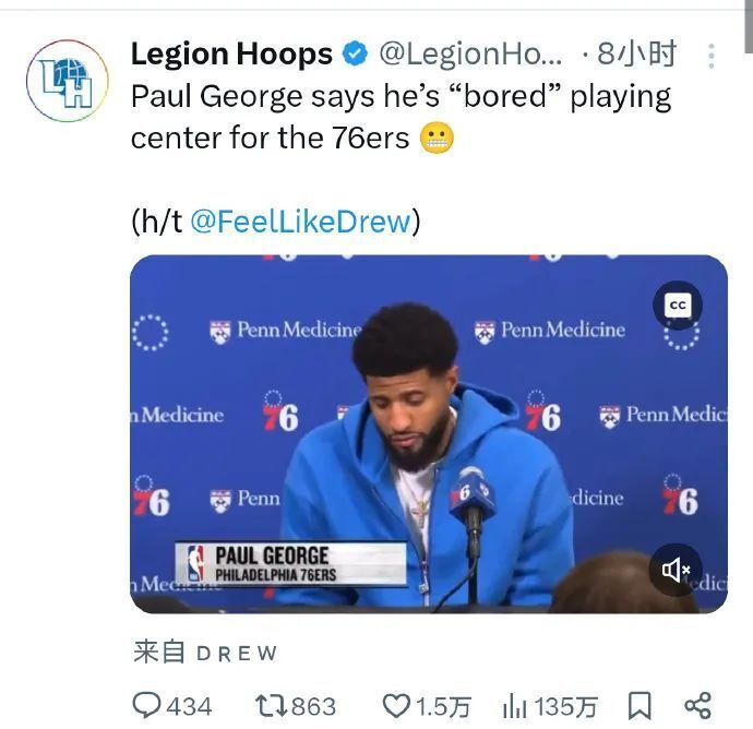 乔治不爽了,公开直言不喜欢费城主帅纳斯让自己打5号位的安排,而是习惯追防小个子球员&侧翼。