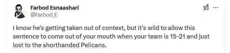 老东家快船队记Esnaashari对乔治上述的言论进行了评论,表示:“我知道他的话被断章取义了,但你所在的球队战绩15胜21负,且刚刚还输给了缺兵少将的鹈鹕,现在竟然敢说出这种话,实在太离谱了。”