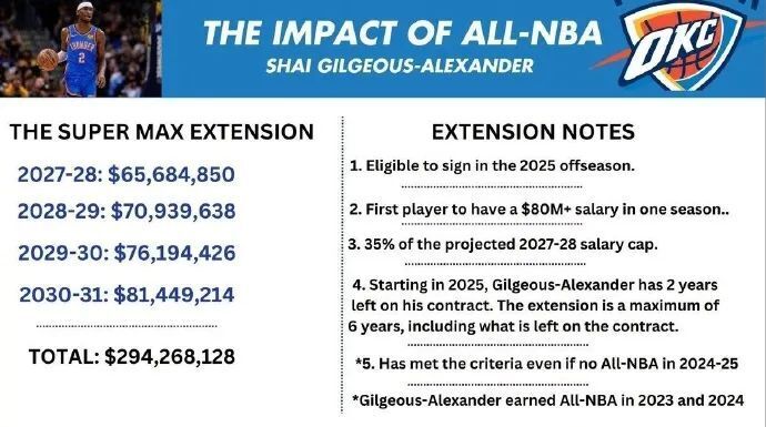 薪资专家Marks表示,亚历山大目前合同将于27年到期,今夏有资格与雷霆提前续签4年合同,且因23年与24年均入选最佳阵容,所以能签约超级顶薪;