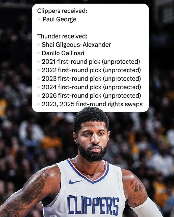 19年夏天,NBA完成了一笔惊天大交易,当年快船为了得到乔治,打包亚历山大、加里纳利、4个不受保护首轮签、一个乐透保护首轮签和两个首轮签交换权送至雷霆。
