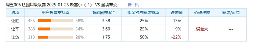 本场比赛中,选欧塞尔让球负的球迷偏少了,只有28%的球迷选择让球负选项,这场比赛中,大家都看好主队的欧塞尔会赢得这场比赛,不看好圣埃蒂安能在客场保住不败,但是这也与奖金对应赛果概率的50%相差22%。