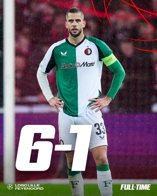 尽管在客场惨败,但是也无碍费耶诺德晋级欧冠淘汰赛附加赛,他们联赛阶段积13分排名第19位晋级。