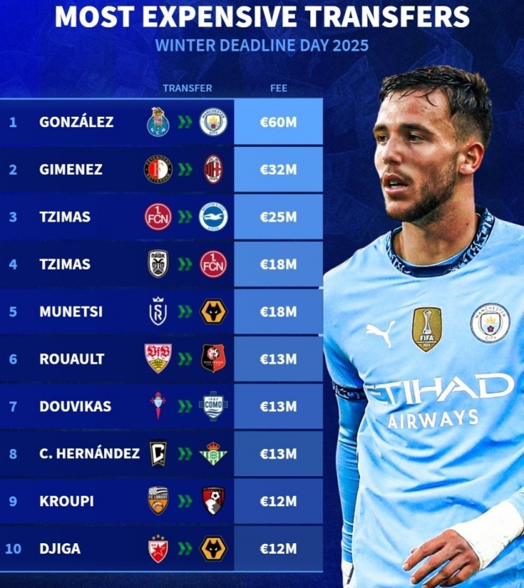 nba直播讯 五大联赛冬窗转会窗口已经关闭,德国转会市场网站(Transfermarkt)统计了截止日的最贵转会榜单。曼城新援尼科-冈萨雷斯以6000万欧元的转会费位居榜首,成为冬窗的标王。