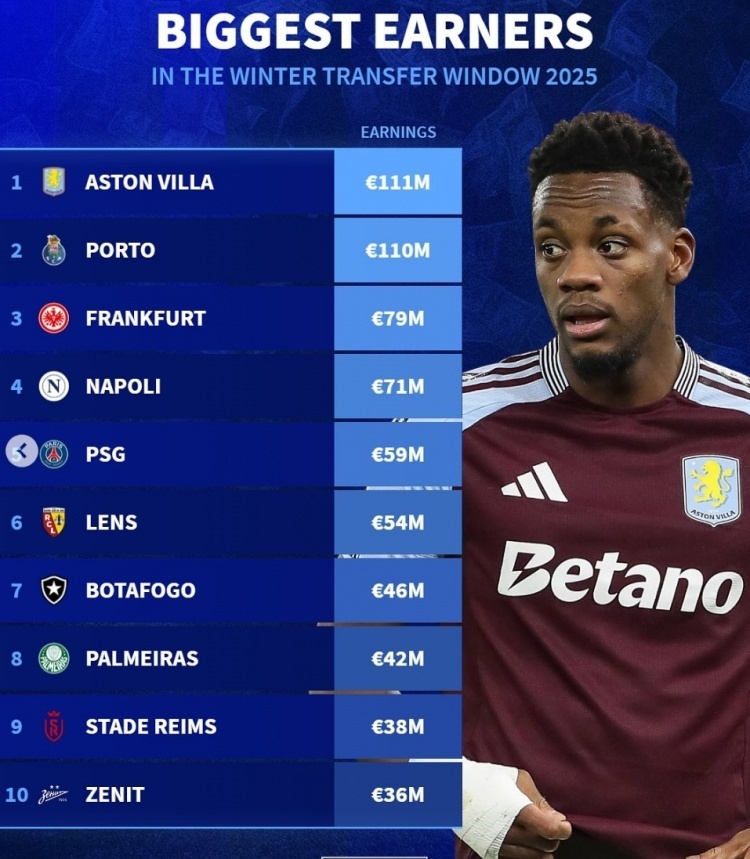 nba直播讯 据《转会市场》统计,2024年冬季转会窗五大联赛各队的收入情况已经出炉,阿斯顿维拉以1.11亿欧元的收入力压波尔图,位居榜首。