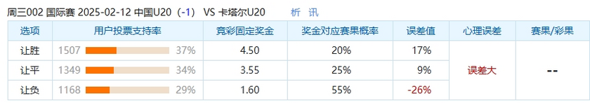 本场比赛中,选国足U20让球负的球迷偏少了,只有29%的球迷选择让球负选项,这场比赛中,大家都看好主队的国足U20会赢得这场比赛,不看好卡塔尔U20