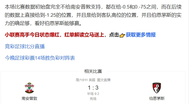 上半场,埃瓦尼尔森打破场上僵局,瓦塔拉破门扩大比分,塞梅诺建功帮助伯恩茅斯半场3-0领先南安普顿,下半场,贝里斯为南安普顿扳回一城,随后双方均无建树。最终,伯恩茅斯3-1击败南安普顿,此役过后,南安普顿联赛6轮仅取得1平5负的战绩,本赛季还未尝胜绩。接下来,南安普顿将在客场挑战阿森纳。作为本赛季的夺冠热门,阿森纳面对如此状态的南安普顿,自然不会错过拿下三分的机会。尽管阿森纳在周中有欧冠的比赛要应对,但即使如此,他们依然在主场有着强大的胜算。可以想象,在即将到来的比赛中,南安普顿想要在阿森纳身上拿到赛季首胜的难度将是相当大的。