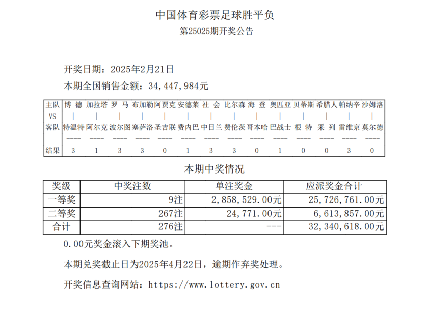 nba直播讯 2月21日,足彩第25025期开奖结果正式公布。本期一等奖共开出9注,单注奖金高达2,858,529元;二等奖则有267注中奖,单注奖金为24,771元。此外,此前滚存的1029万元奖金在本期被清空。任选九场方面,本期共开出875注,单注奖金为15,323元。本期足彩总销量为34,447,984元,其中任选九场的投注总额为20,950,442元。