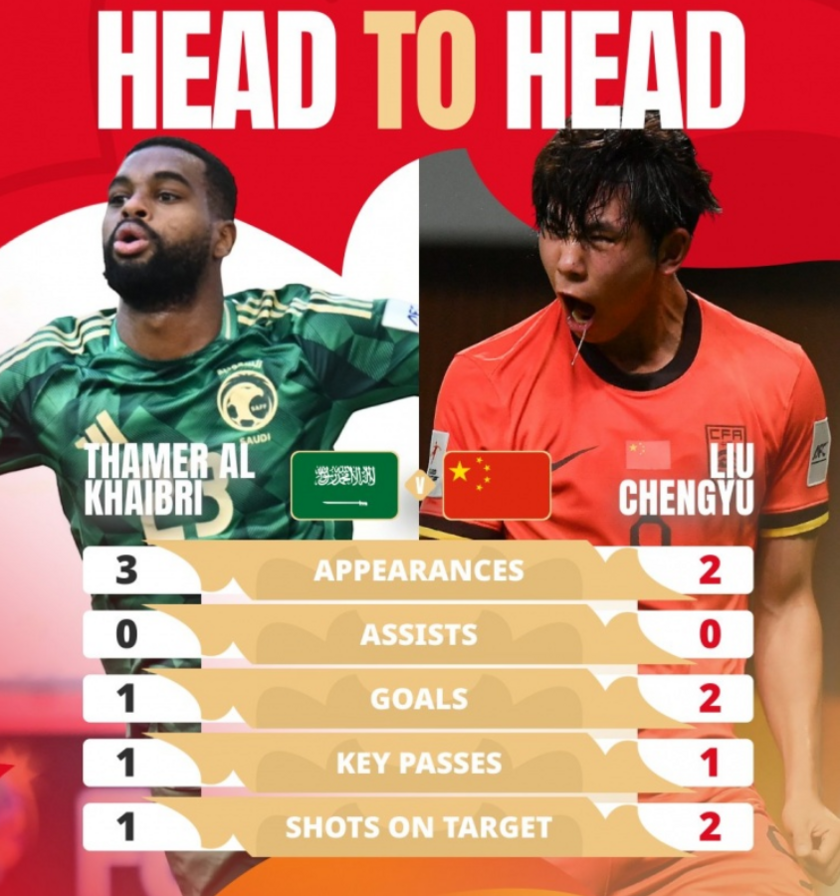 亚足联官推今日晒出海报为这场焦点之战预热,海报上出镜的分别是国青前锋刘诚宇和沙特 U20 前锋海布里。刘诚宇状态出色,在 2 场比赛 2 次射正就斩获 2 个进球,还有 1 次关键传球。海布里在 3 场比赛中 1 次射正打进 1 球,也有 1 次关键传球。亚足联官推配文道:“两名前锋的故事。谁能够更胜一筹,帮助所在球队晋级到本届 U20 亚洲杯四强当中?”