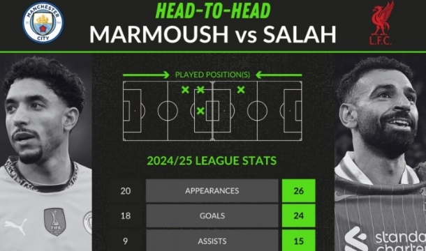 nba直播讯 曼城将在本轮英超焦点战主场迎战利物浦,马尔穆什和萨拉赫将上演开罗德比,列出了两人本赛季联赛关键数据对比。