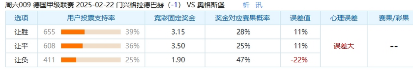 本场比赛中,选门兴让球负的球迷偏少了,只有25%的球迷选择获让球胜选项,这场比赛中,大家都看好门兴主场会赢得这场比赛,不看好奥格斯堡能客场保住不败,但是奖金对应赛果概率的47%相差22%,数据误差较大。