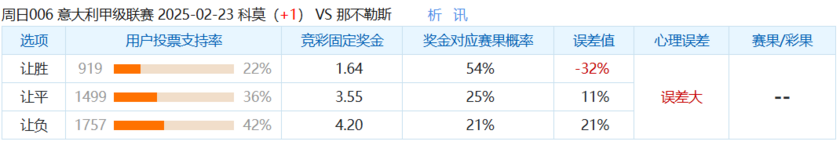本场比赛中,选科莫让球胜的球迷偏少了,只有22%的球迷选择获让球胜选项,这场比赛中,大家都看好那不勒斯客场会赢得这场比赛,不看好科莫能主场保住不败,但是奖金对应赛果概率的54%相差32%,数据误差较大。