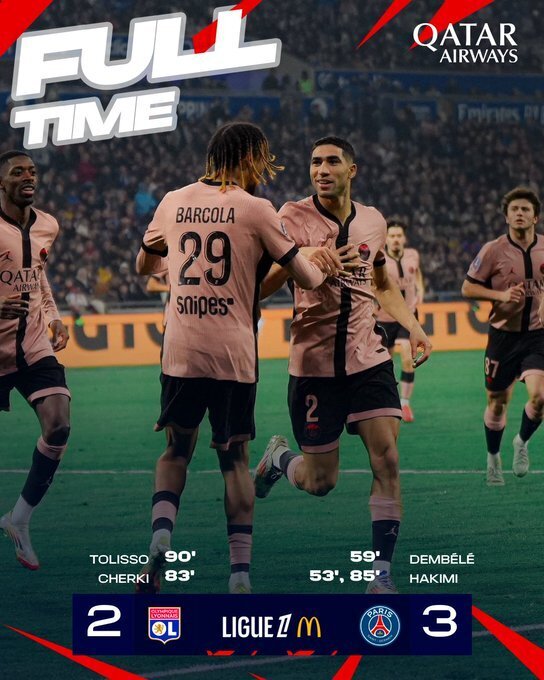 比赛关键事件如下:第53分钟,巴尔科拉左路下底倒三角传球,阿什拉夫在大禁区后点推射破门,巴黎圣日耳曼1-0领先里昂。第59分钟,克瓦拉茨赫利亚分球,登贝莱突入禁区后左脚爆射得手,巴黎将比分扩大为2-0。第83分钟,切尔基为里昂扳回一城,比分变为1-2。第85分钟,阿什拉夫再次建功,完成梅开二度,巴黎3-1领先。补时阶段,托利索头球破门,但巴黎最终仍以3-2的比分战胜里昂。此役过后,巴黎圣日耳曼继续在法甲积分榜上保持领先优势,阿什拉夫的双响和登贝莱的进球成为比赛的关键。