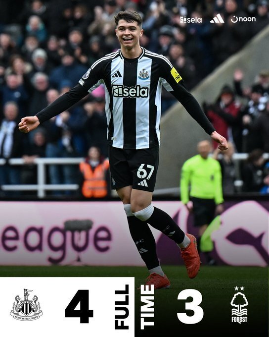 下半场,诺丁汉森林展开反击,第62分钟,米伦科维奇利用角球机会蝎子摆尾破门,比分变为2-4。补时阶段,耶茨抓住纽卡解围失误近距离打门得手,比分最终定格在3-4。纽卡凭借上半场的爆发式表现,最终4-3险胜诺丁汉森林,终结联赛两连败,伊萨克的双响成为球队获胜的关键。