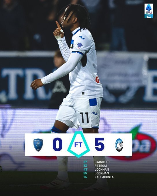 第26分钟,亚特兰大率先打破僵局,扎帕科斯塔左路禁区外脚背传球,皮球打在焦希身上折射入网,恩波利0-1亚特兰大。第33分钟,亚特兰大扩大比分,卢克曼左路传中,吉姆西蒂头球摆渡,雷特吉凌空推射破门,比分变为0-2。第42分钟,雷特吉直塞,卢克曼单刀过掉门将后推射空门得手,比分改写为0-3。下半场第54分钟,卢克曼左路小角度抽射破门,完成双响,比分扩大为0-4。第73分钟,扎帕科斯塔左路内切低射破门,将比分锁定为0-5。此役过后,亚特兰大距榜首仅差3分,卢克曼的双响和雷特吉的传射成为比赛关键。