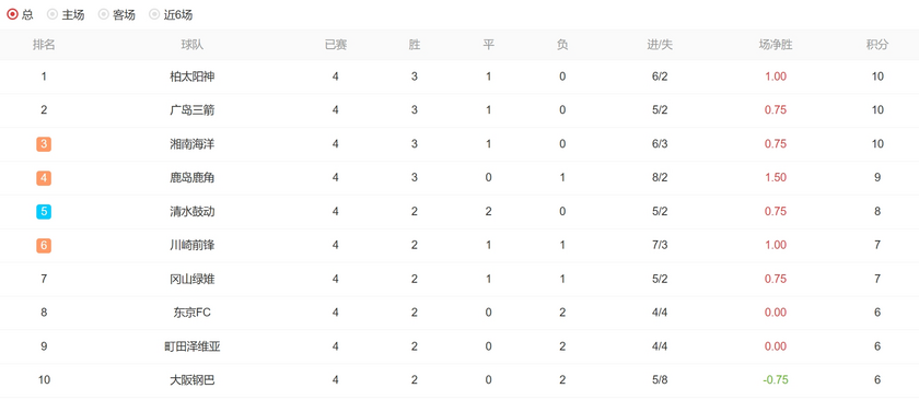 北京时间3月2日,随着浦和红钻0-2柏太阳神的比赛结束,日职联第4轮全部完赛。当前积分榜排名前三名战绩相同,都是3胜1平,分别是柏太阳神、广岛三箭和万年保级队湘南海洋。