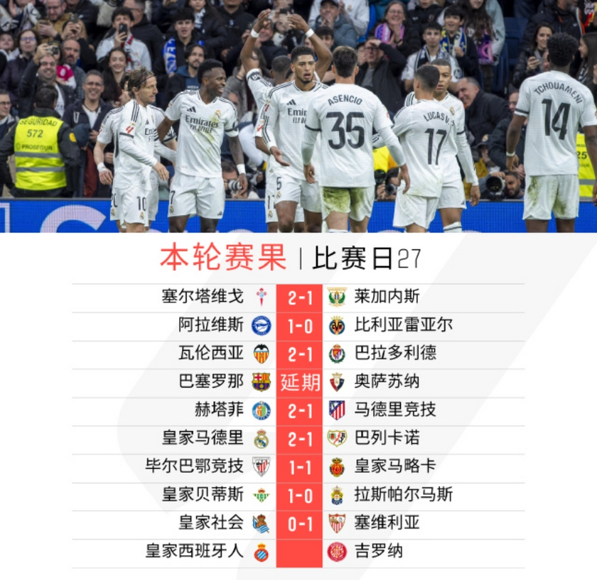 nba直播讯 北京时间今天凌晨,西甲第27轮赛事,除了明天凌晨的西班牙人vs赫罗纳和巴萨的比赛外,其余8场比赛悉数结束,以下是2024-25赛季西甲第27轮的综述: