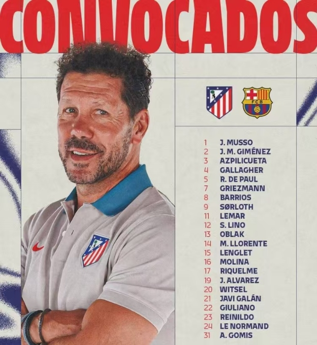 前锋:格列兹曼、瑟洛特、胡利安·阿尔瓦雷斯、朱利亚诺·西蒙尼