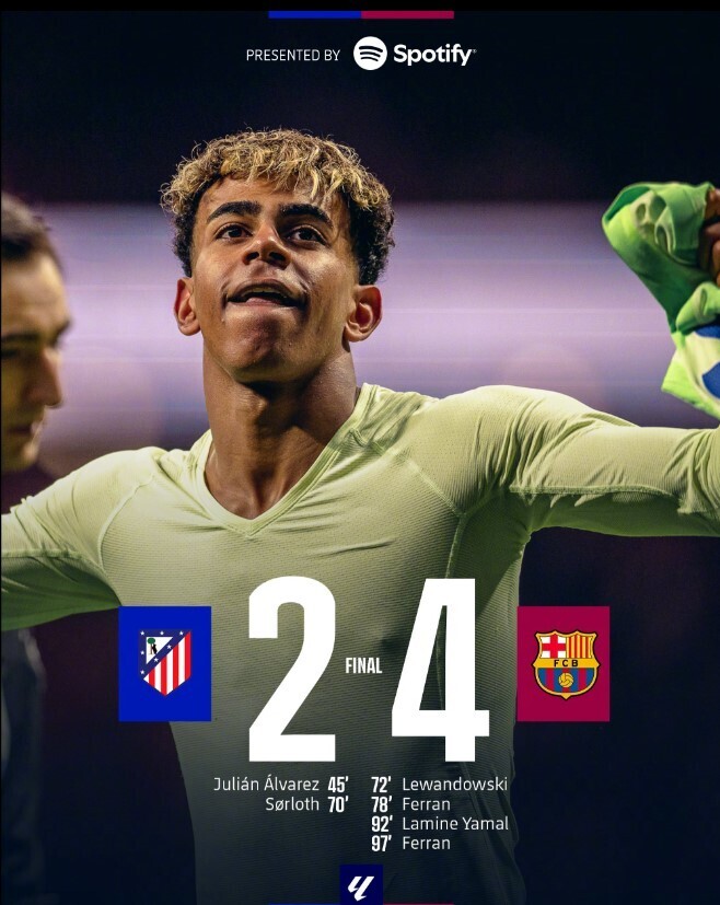 在西甲第28轮比赛中,巴萨客场挑战马竞,上演了一场荡气回肠的逆转好戏。上半场,马竞凭借阿尔瓦雷斯的进球取得领先;下半场,瑟洛特的进球帮助马竞将比分扩大至2-0。然而,巴萨并未放弃,莱万和费兰-托雷斯在6分钟内连入两球,将比分扳平。伤停补时阶段,亚马尔的远射折射入网,帮助巴萨反超比分。读秒阶段,费兰-托雷斯抓住马竞失误再下一城,最终巴萨4-2完成逆转。
