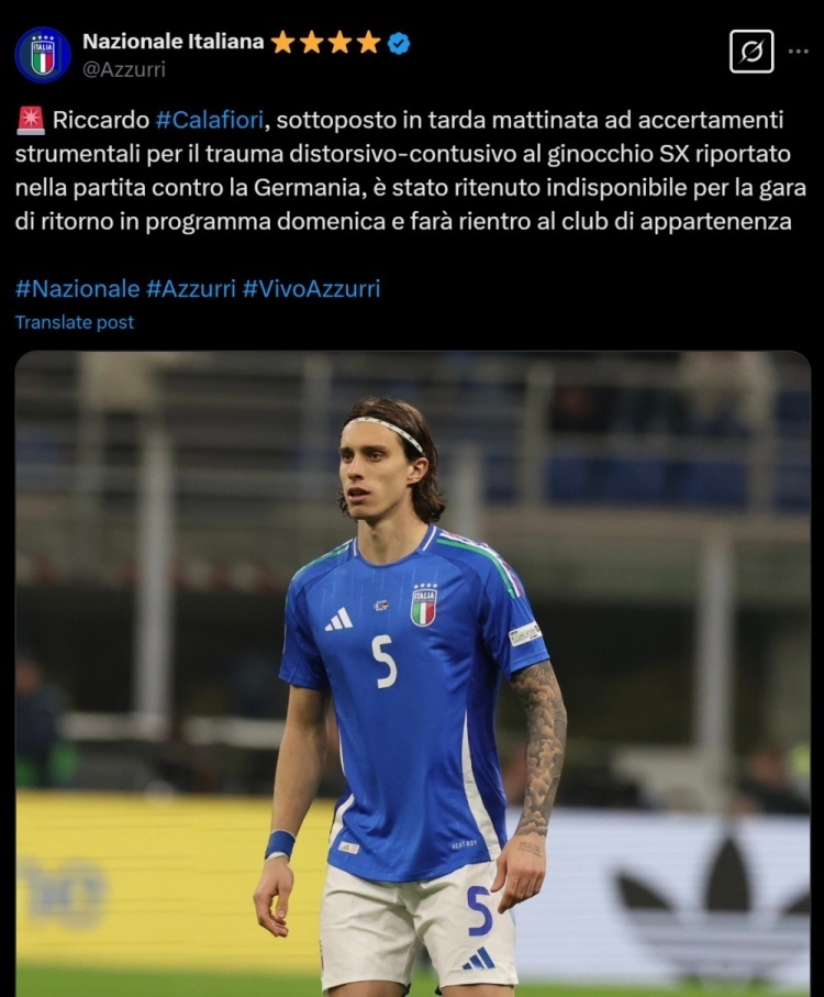 意大利国家队更新了卡拉菲奥里的伤情:“今天上午晚些时候,卡拉菲奥里接受了检查,以确定他在对阵德国的比赛中左膝扭伤和挫伤的程度。他已确定无法参加对阵德国的次回合比赛,并将回到他的俱乐部。”