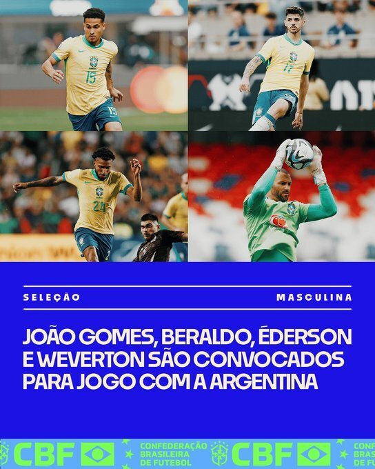 巴西足协发布公告称,巴黎圣日耳曼后卫贝拉尔多、狼队中场若昂-戈麦斯、亚特兰大中场埃德森以及帕尔梅拉斯门将韦弗顿已被主教练多里瓦尔补招入队,将出战与阿根廷的南美区世预赛第14轮。这四名球员将顶替加布里埃尔、吉马良斯、热尔松和阿利森的位置。