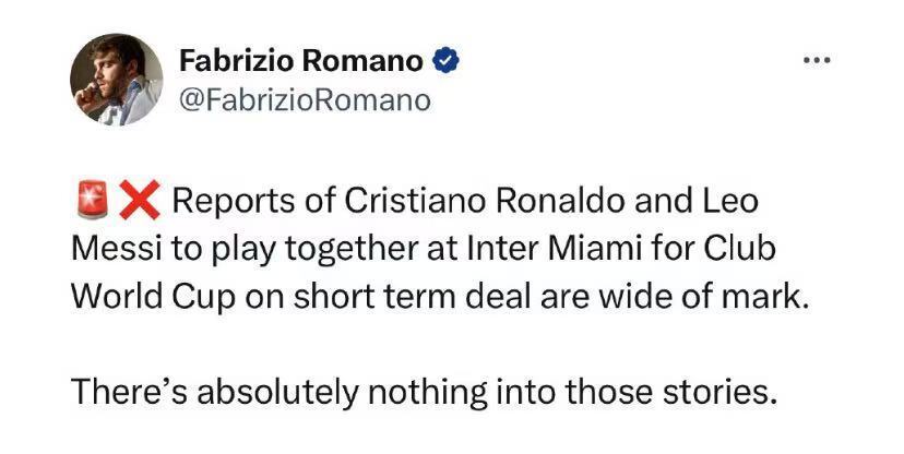 记者罗马诺报道称,有关C罗将短期加盟迈阿密国际并和梅西一同参加世俱杯的传闻完全不实,此类报道毫无事实依据,纯属虚构。