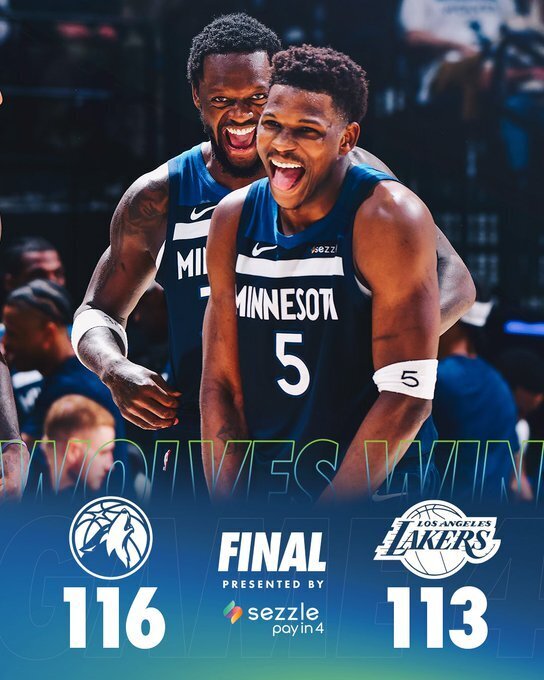 易边再战,湖人占得先机,连中三分轰出11-0的攻击波夺回领先,森林狼内外开花顽强咬住,八村塁和里夫斯联手拿分,帮助球队重获两位数优势。末节,爱德华兹4分钟砍下11分,里德也连续拿分帮助球队追赶,双方争夺陷入白热化。关键时刻,麦克丹尼尔斯打成2+1,湖人发球失误,爱德华兹运球失误,但森林狼挑战成功改判詹姆斯犯规,爱德华兹两罚全中后里夫斯绝平三分没有。最终,森林狼以116-113力克湖人,总比分3-1领先。