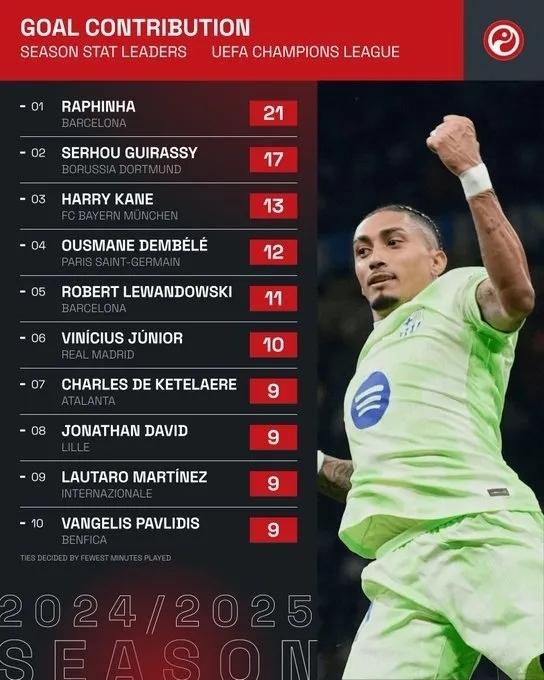 nba直播讯 北京时间5月9日,本赛季欧冠半决赛战罢,媒体统计了本赛季欧冠参与进球数榜单,拉菲尼亚21球位居榜首,吉拉西17球位居次席,登贝莱12球排第4。