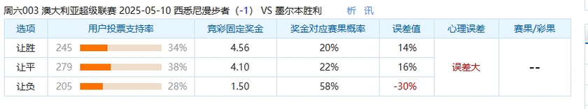 本场比赛中,选择墨尔本胜利让球负的球迷偏少了,只有28%的球迷选择让球负选项,这场比赛中,大家都看好主场的西悉尼漫步者会能够直接赢或者大胜赢得这场比赛,不看好墨尔本胜利能在客场保住分数,但是这也与奖金对应赛果概率的58%相差30%。