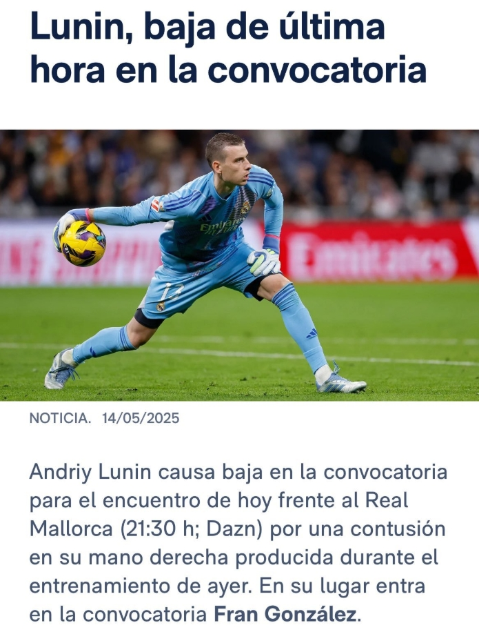 北京时间5月14日,皇马官方公布球员伤情公告,门将卢宁在训练中右手受伤,退出本轮西甲名单,弗兰-冈萨雷斯递补入选。