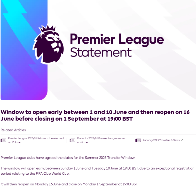 英超官网消息:英超俱乐部已经商定了2025年夏季转会窗口的日期。由于与世俱杯的特殊注册需求,英超夏窗将分两个窗口开放:6月1日周日至6月10日周二19时(北京时间11日凌晨2时),首度开放;6月16日周一至9月1日周一19时(北京时间11日凌晨2时),将开放第二次窗口。