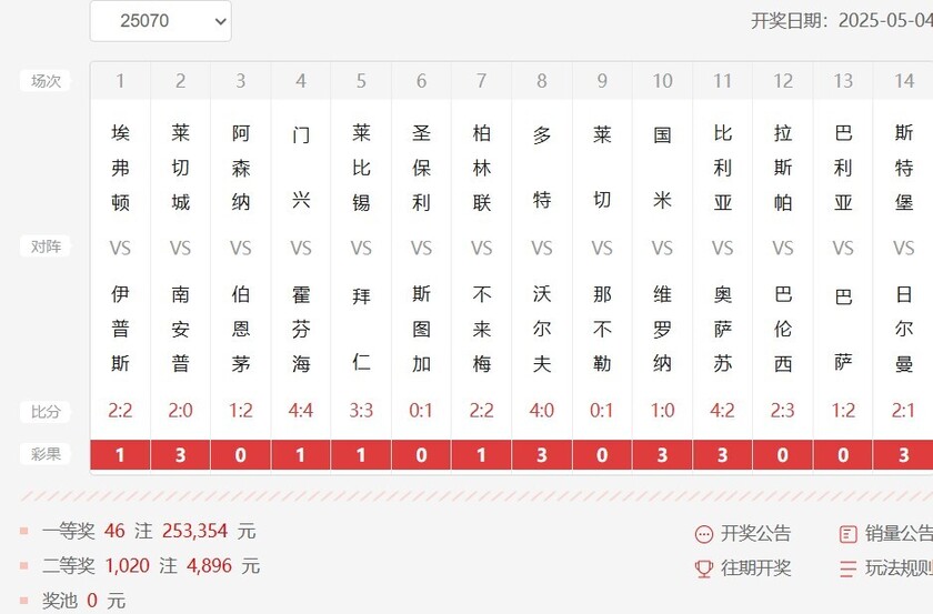 足总杯决赛水晶宫1-0战胜曼城夺冠,打出4倍小冷赛果;奥格斯堡主场1-2不敌柏林联合、美因茨2-2战平勒沃库森、莱比锡2-3斯图加特、波鸿客场2-0战胜圣保利,均打出3倍以上赛果。