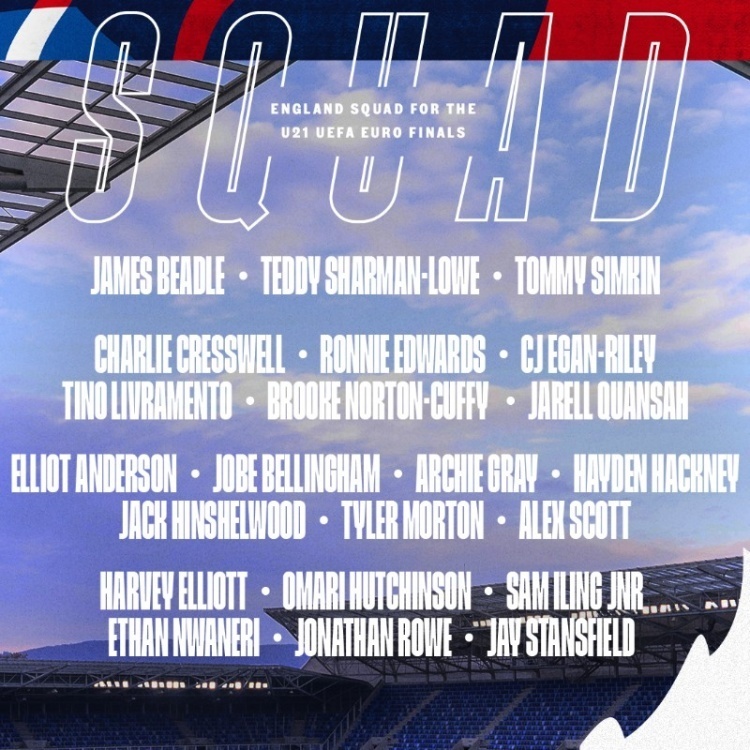 nba直播讯 北京时间6月4日,英格兰公布了U21欧洲杯球员名单,埃利奥特、宽萨、小贝林厄姆在列。