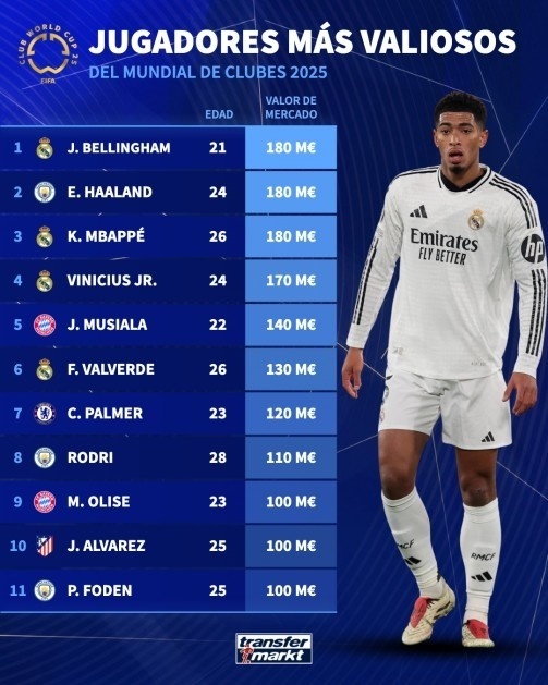 nba直播讯 北京时间6月17日,德转盘点了本届世俱杯球员身价排行榜,贝林厄姆、哈兰德、姆巴佩并列第一,阿尔瓦雷斯上榜,前十榜单中有4位来自皇马,曼城有三位上榜。