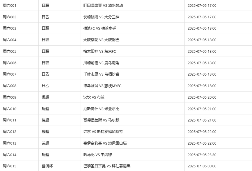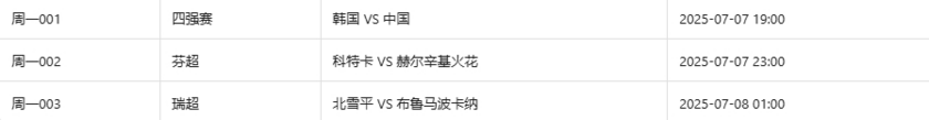 北京时间7月4日,竞彩开售周五赛事6场,世俱杯四分之一决赛开战,弗鲁米嫩塞VS利雅得新月,帕尔梅拉斯VS切尔西,周六-周一赛事预计共开售44场,世俱杯四分之一决赛胜平负单关,美金杯决赛开战!国足东亚杯首战韩国!美职联新一轮常规赛开战,挪超、芬超、瑞典超、日职、日乙重燃战火。