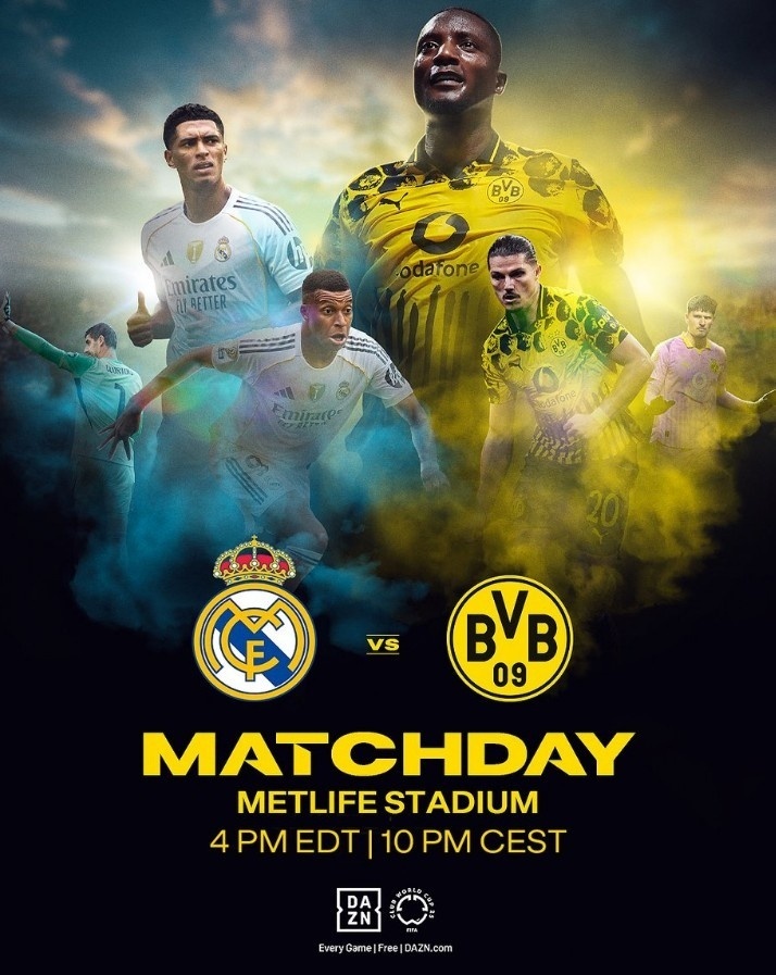 nba直播讯 北京时间07月05日,明日凌晨4:00,多特将在世俱杯1/4决赛对阵皇马,为此球队官方也发布海报为本场比赛预热,海报中多特球员吉拉西、萨比策以及科贝尔出镜,而皇马方面也有姆巴佩、贝林厄姆、库尔图瓦出镜。